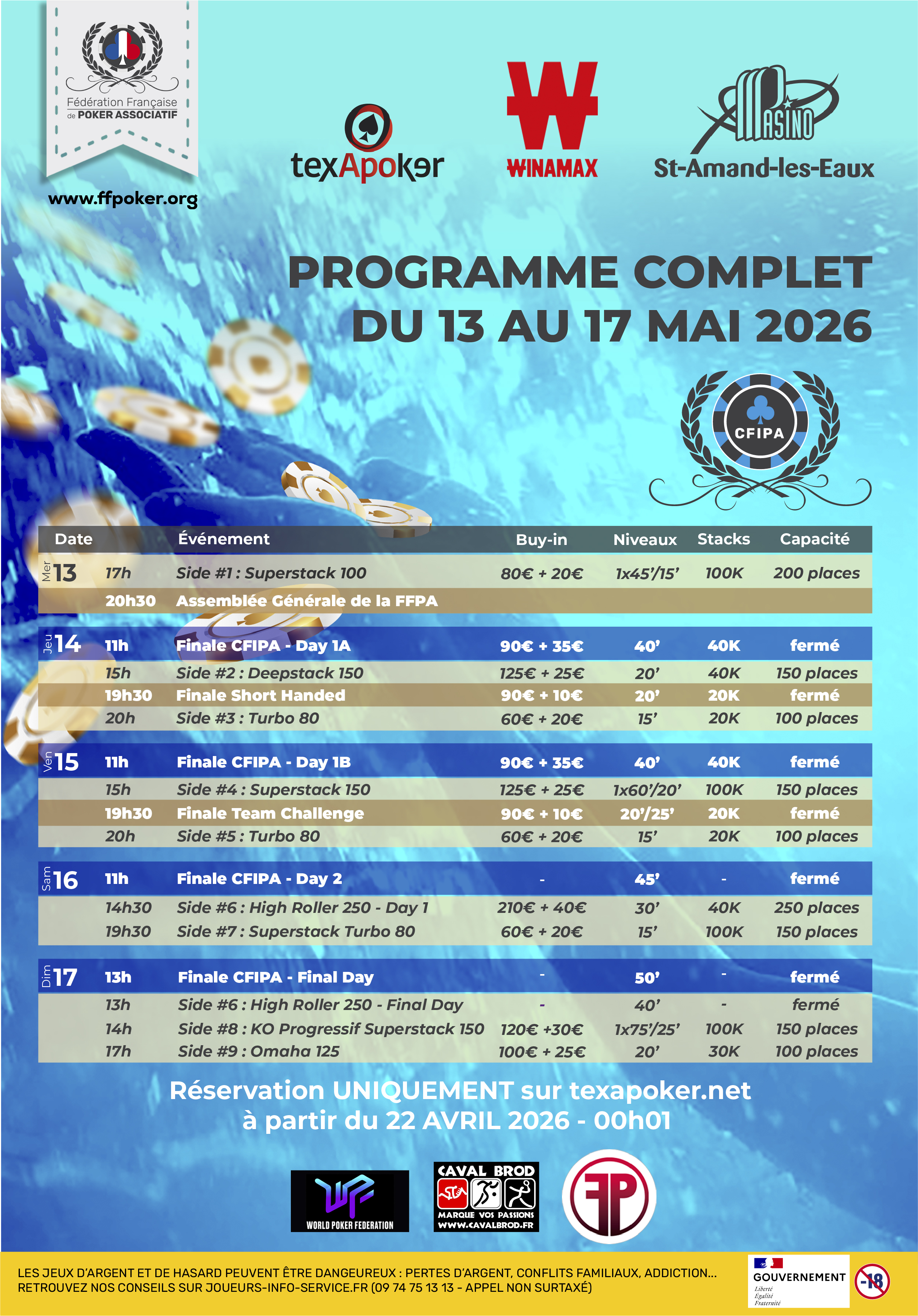 Salut les teams voici l'article sur le Classement Fédéral des Opens de Poker Associatifs. On s'attaque à la présentation des Opens d' avril 2026. Les Opens ou Main Events des clubs adhérents à la...