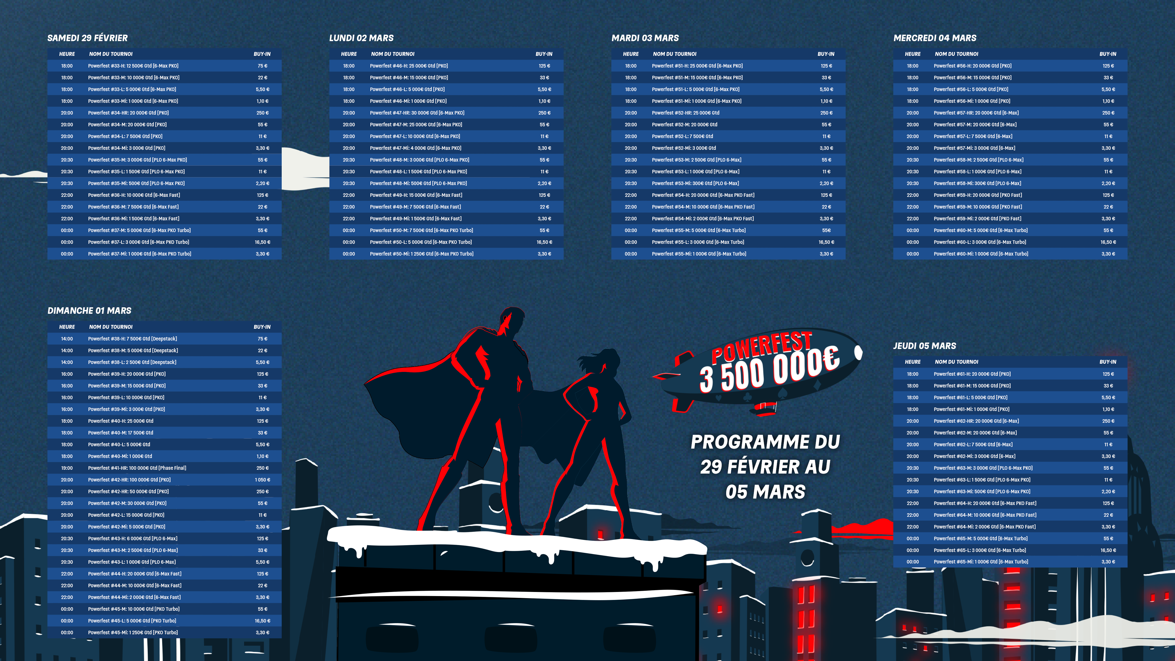 Du 23 février au 10 mars, PMU Poker va vivre au rythme de son festival : le Powerfest PMU ! Deux semaines de compétition, 300 tournois, des buy-in entre 2€ et 2100€ et plus de 3 500 000 € garantis !