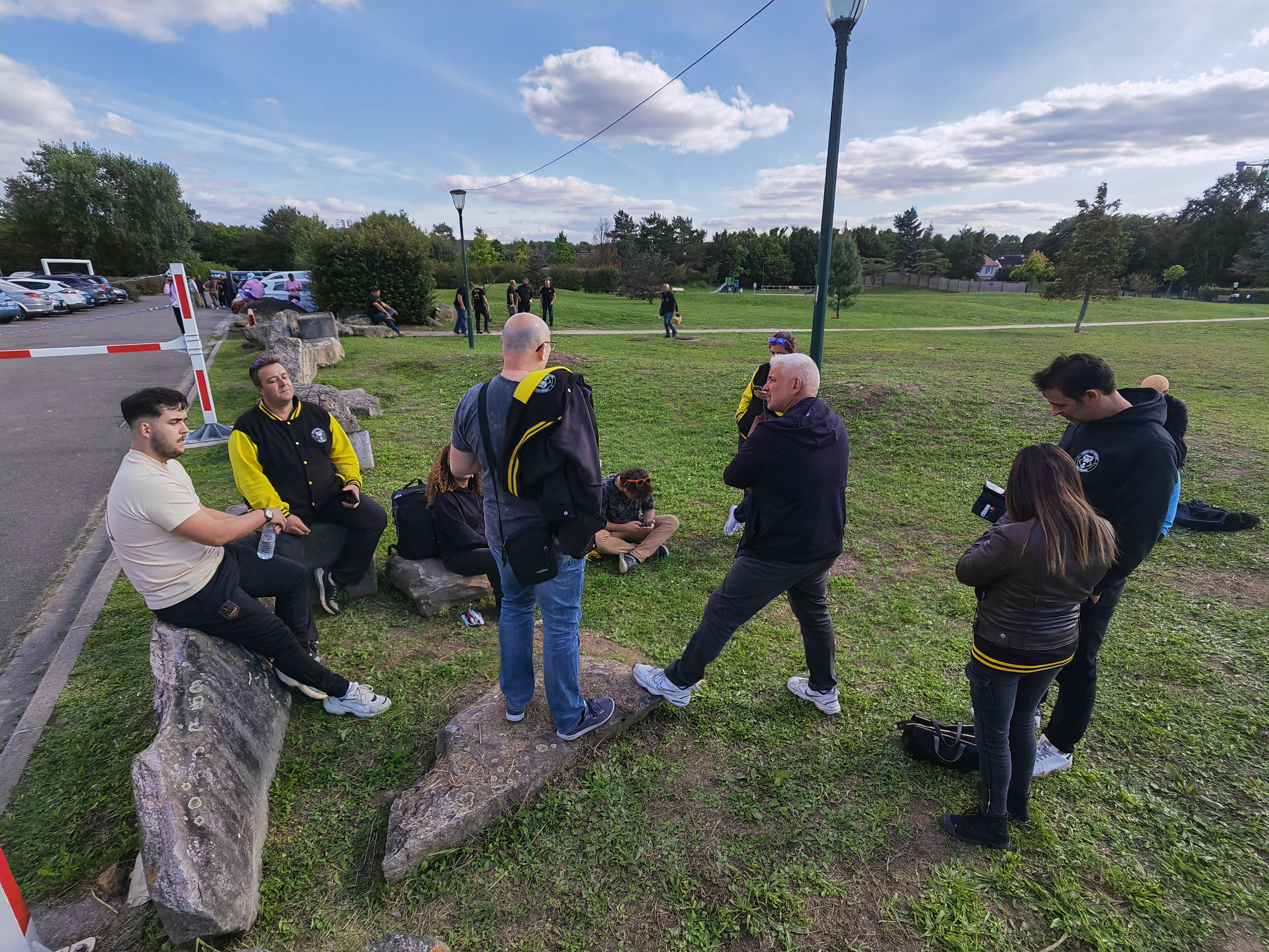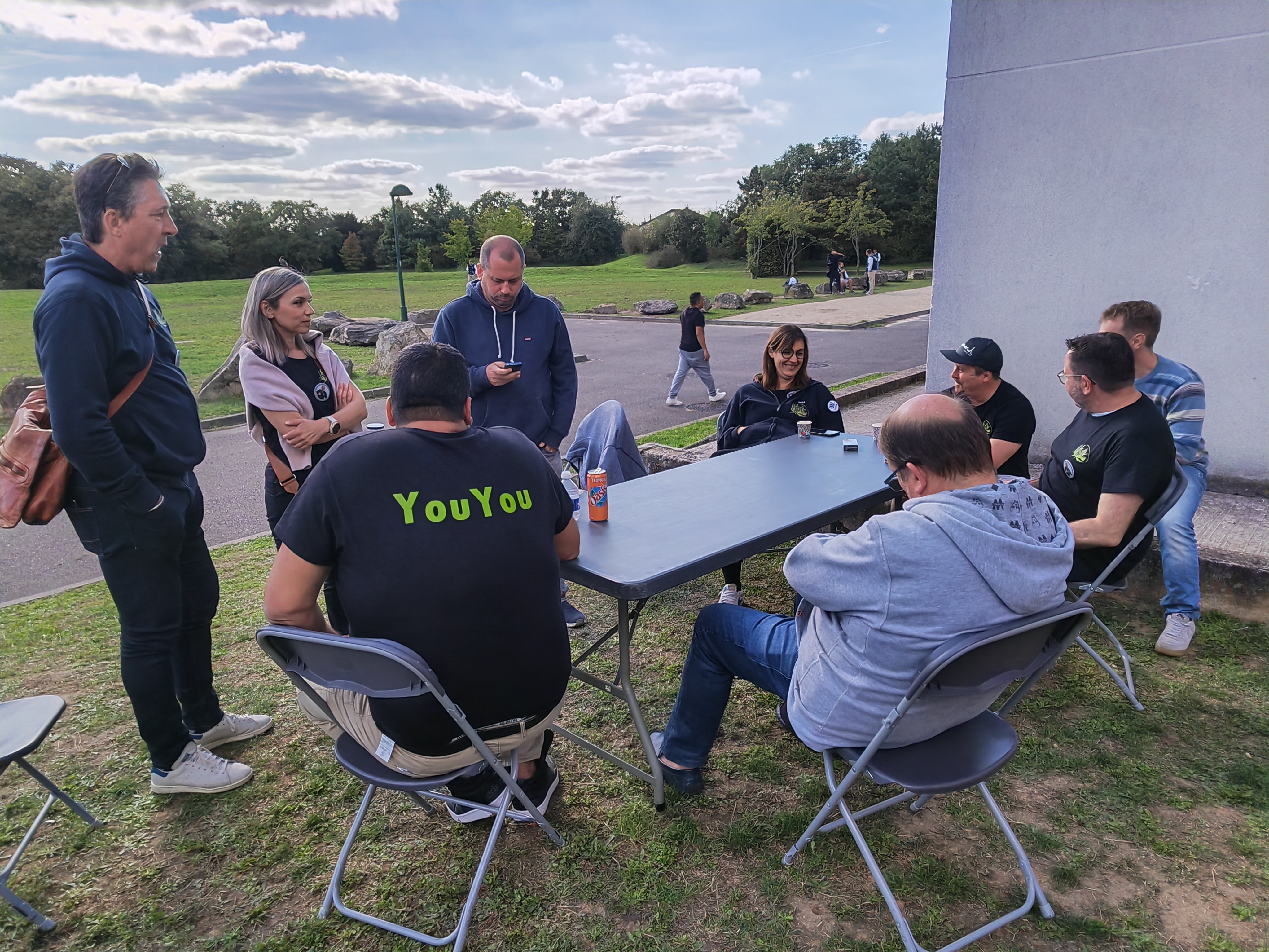 Bon, faut bien l'avouer, ça a moins d'allure que la coiffe des anciens monarques versaillais. Mais ça fait le taff. Solenn 'Batgirl' Thomas et GoLudorAK (à l'arrière-plan, très concentré sur la tactique d'équipe) peuvent ainsi repérer de loin leurs partenaires.
