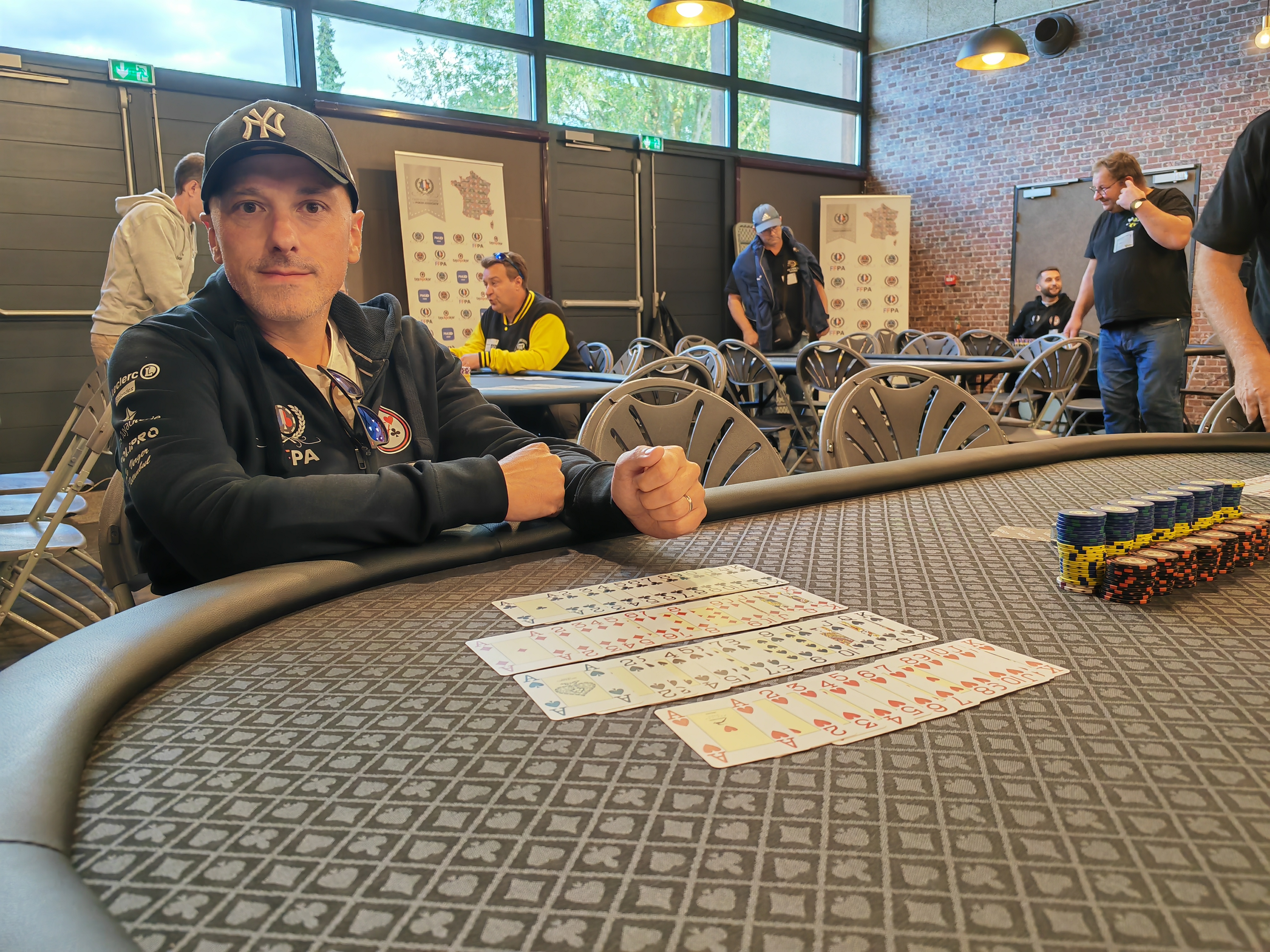 D'un coup d'un seul, le niveau sonore de la salle de jeux dans laquelle se déroule cette finale CFEPA est monté d'un cran. 128 fauves rushent aux tables pour ne pas manquer le shuffle-up and deal de cet après-midi.