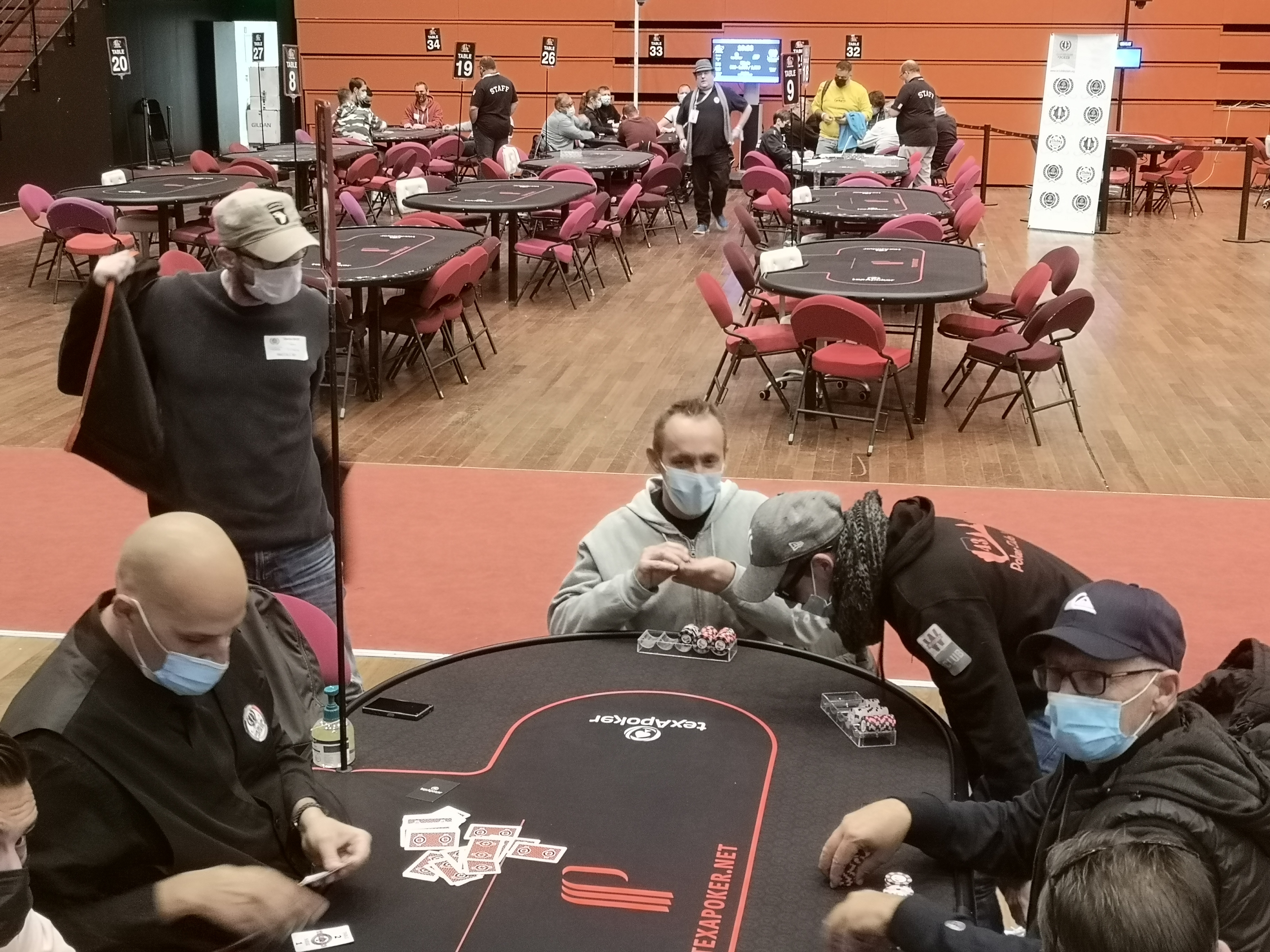 Il reste six tables dans ce Day1A, et chaque table qui casse provoque un mouvement poétique, chaque joueur assis à la table qui casse cherchant son nouveau siège, son rack de jetons à la main. Depuis la scène, on a même pu observer une certains synchronisation entre le départ de Sébastien Grachet (Jur'As Poker Club, sur la gauche), fraichement éliminé), et l'arrivée d'Anthony Lausseur (Poker Club Vellave, 100k jetons, debout sur la droite) et Jean-Claude Boulanger (Club Aspic Poker 06, assis dans le virage), 316k.
