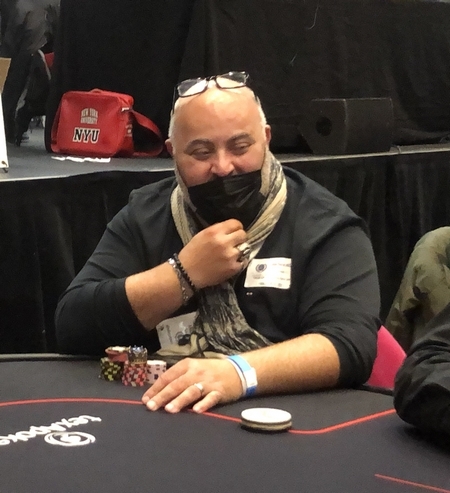 Alors que, pendant la courte pause, je parcourais les tables à la recherche d'un éventuel Chip Leader, je tombais sur un stack à 125k, en table 10. Les joueurs entrant à nouveau dans la salle de spectacles, j'attendai donc l'heureux élu qui aurait droit à son petit article.