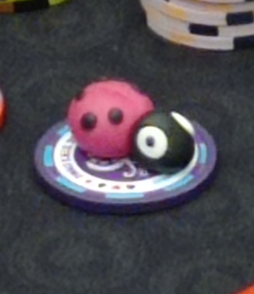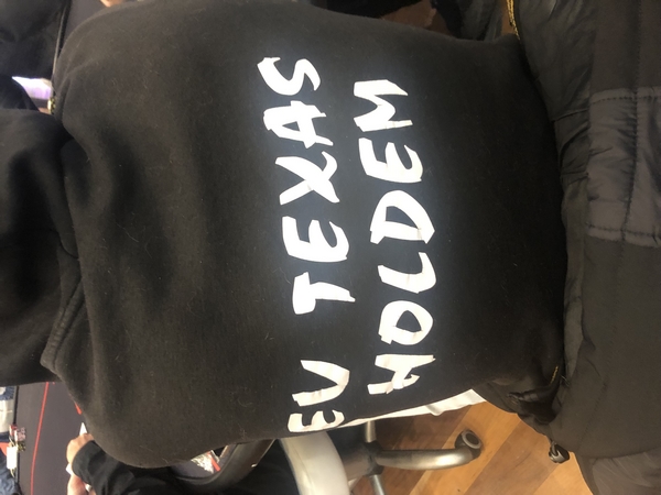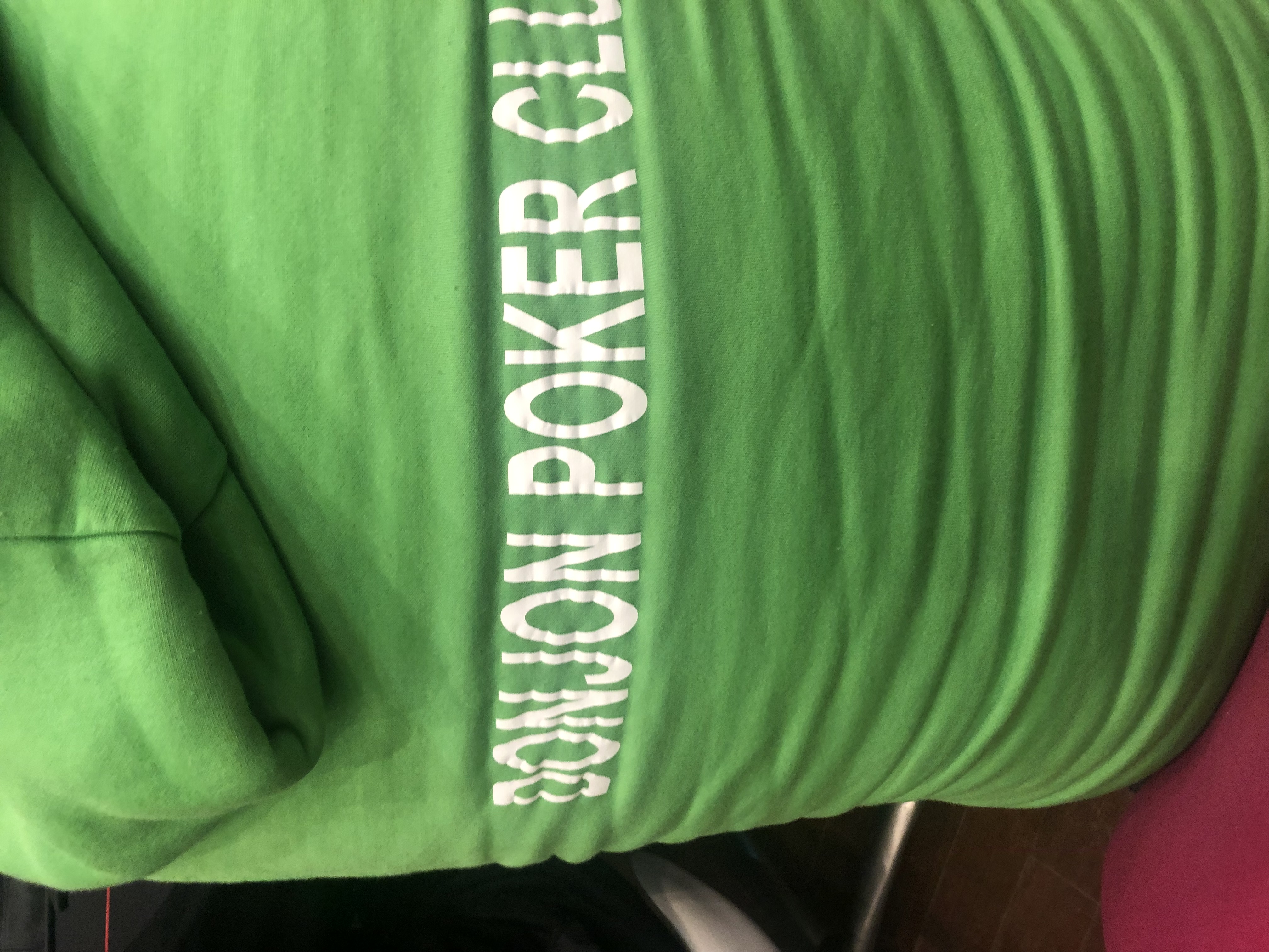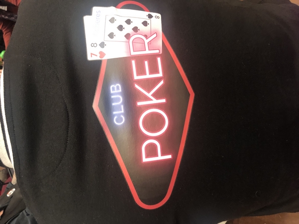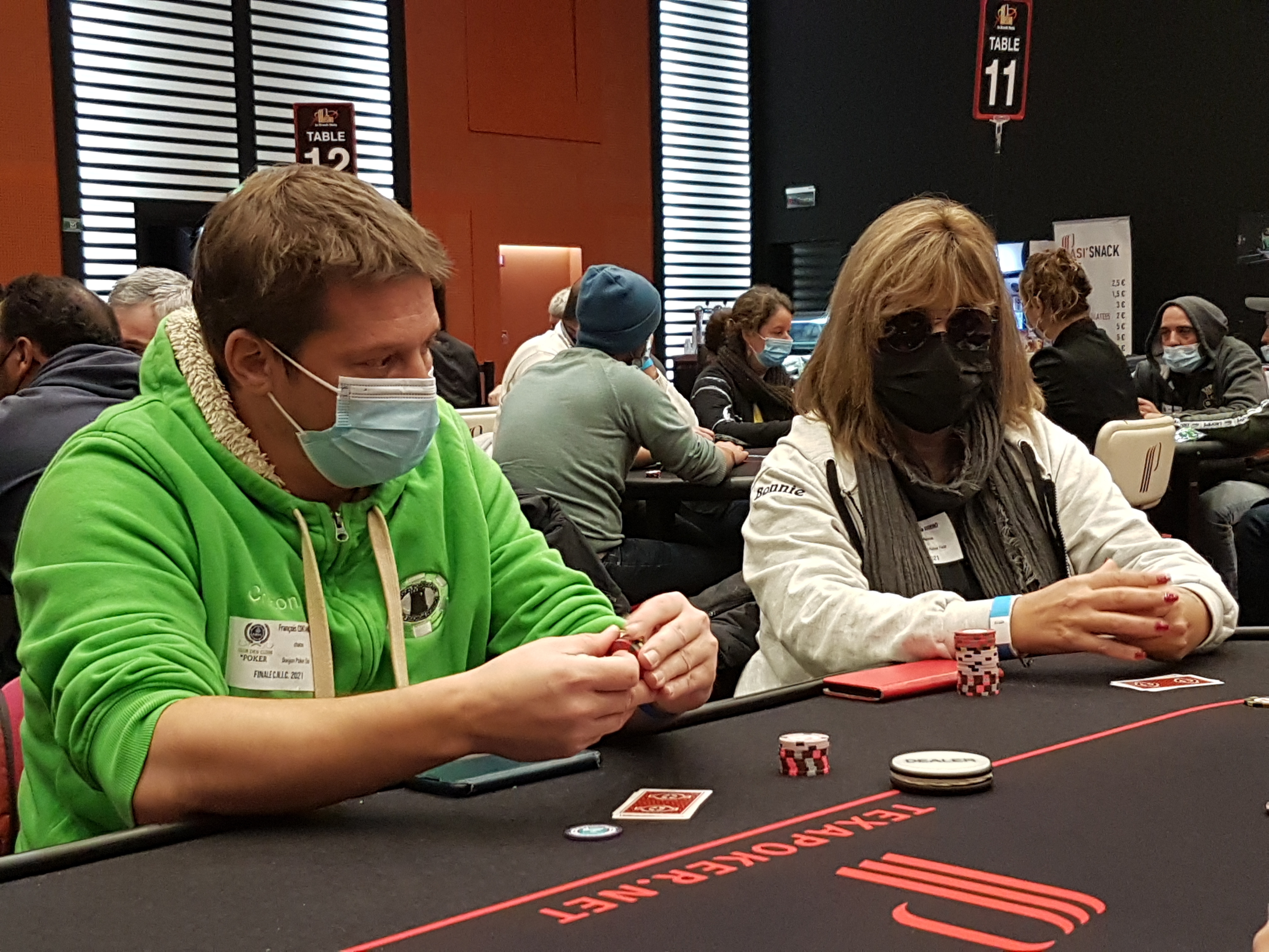 En tournant autour des tables, le beau hoodie vert du Donjon Poker Club se remarque. Alors on cherche un angle d'attaque, et on tombe sur une bataille de blind qui implique 'Chaton' (François Contamine, à gauche donc), qui relance à 500 avec A4o vs Gloria 'Bonnie' Ribeiro (La Team Poker Face, à sa droite).