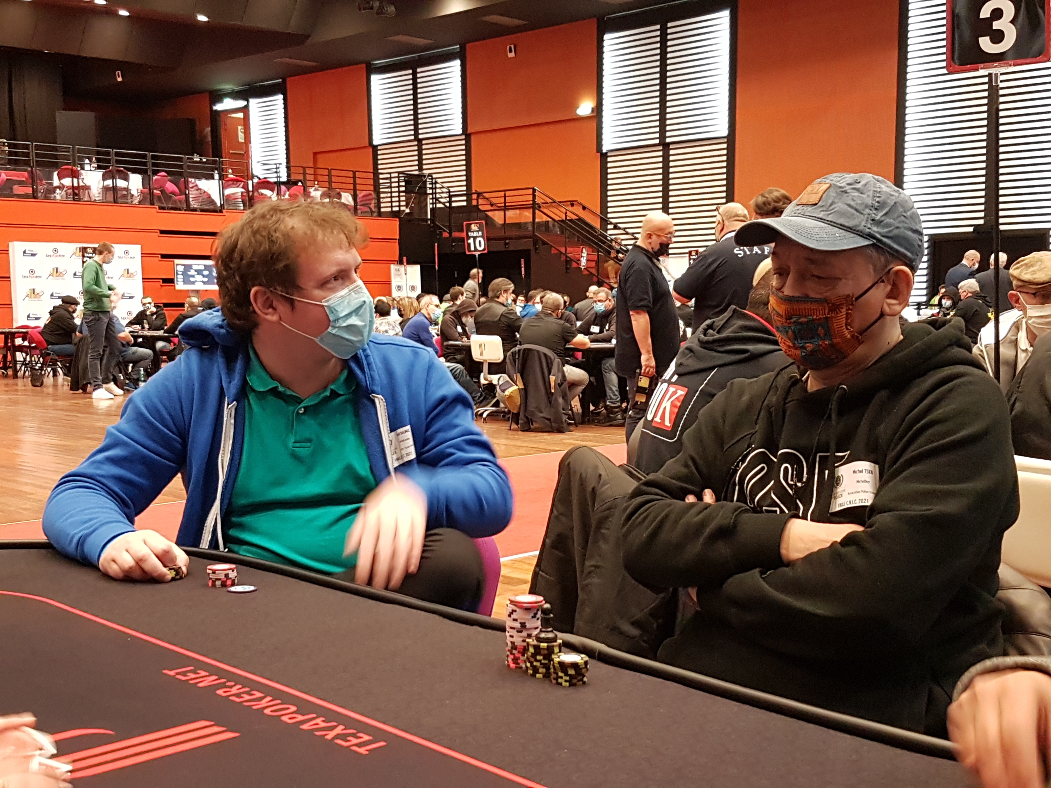 Préflop, Benoît 'Harleycouine' Daumas (Versailles Texas Hold'em, à gauche sur l'image) décide d'open au HJ à hauteur de 600. A sa gauche, Michel 'MichelBey' Tsien (Association de Poker Isséenne, sur la droite), décide d'aller setmine avec 33. Et setminé il a, le bougre ! Le flop s'affiche 387.