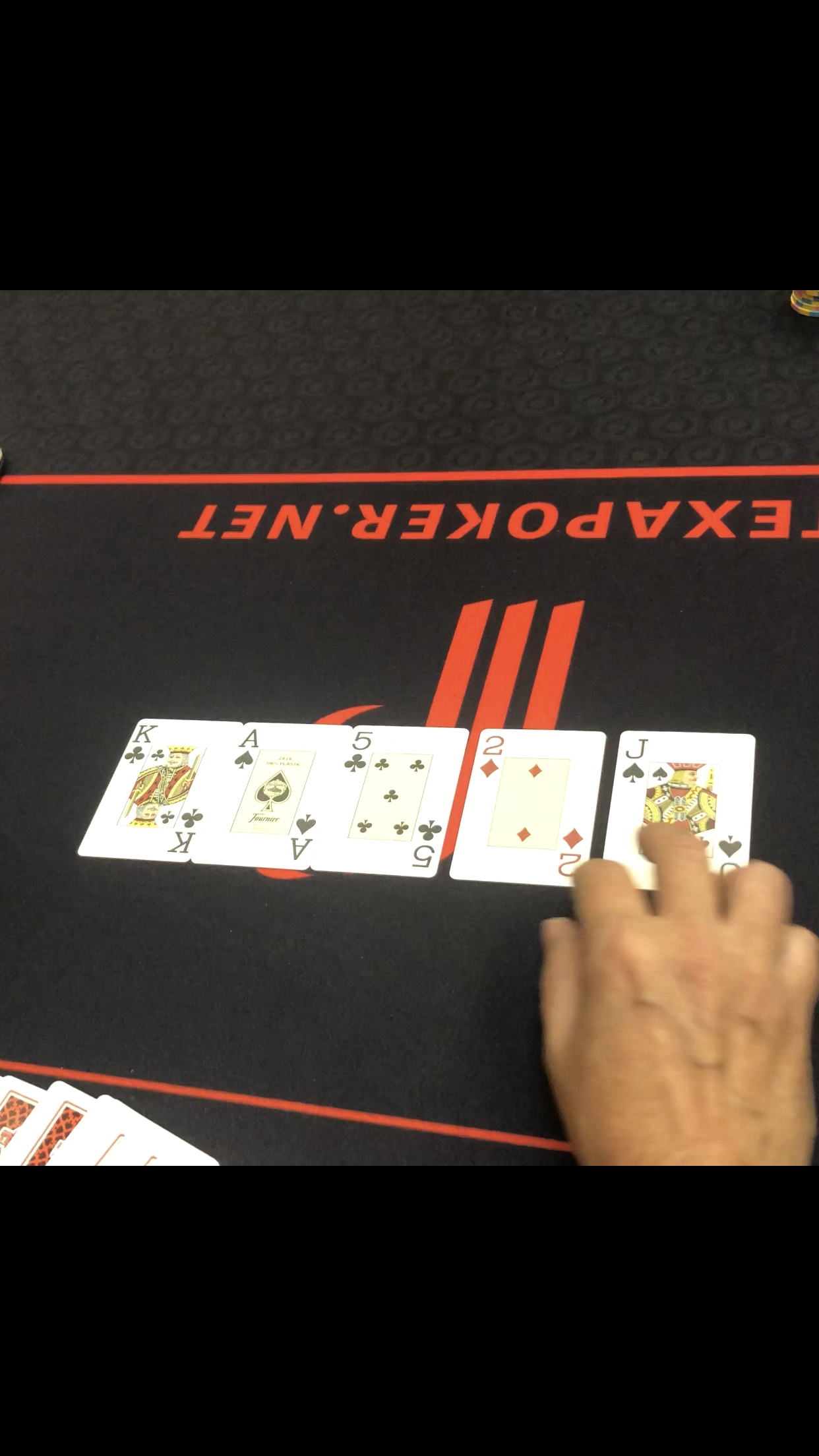 Le flop KA5 donnant une paire à chacun puis le 2 et le J river.