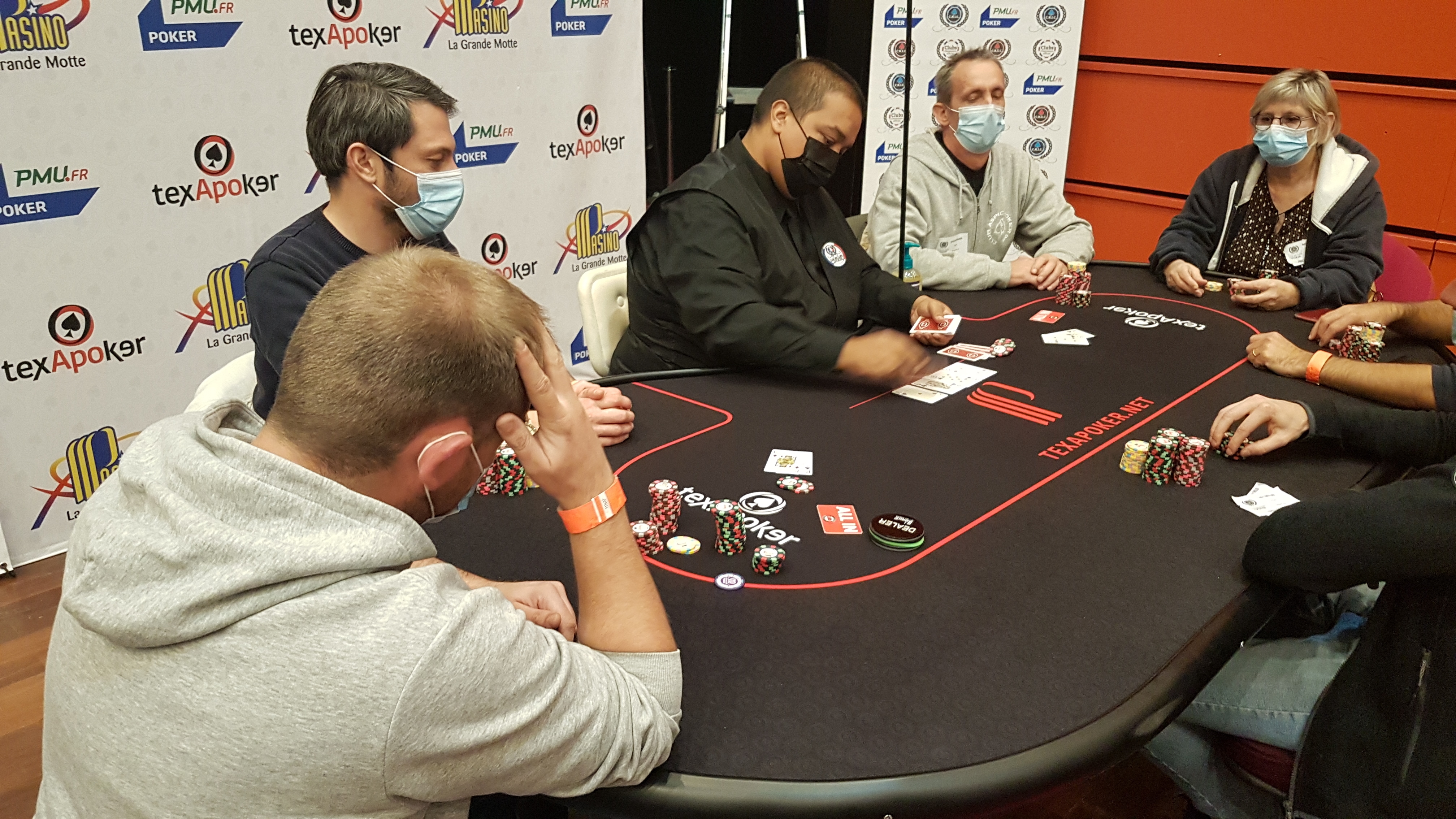 UTG, Jean-Claude Boulanger (Club Aspic Poker 06) envoie ses 860k. Julien 'Jeujeu71' Meunier (Tapons Poker Club), décide lui aussi de tout mettre au milieu. EZ push, avec KK. Le problème, c'est que les barbus seront dominés par le A5 de Jean-Claude...