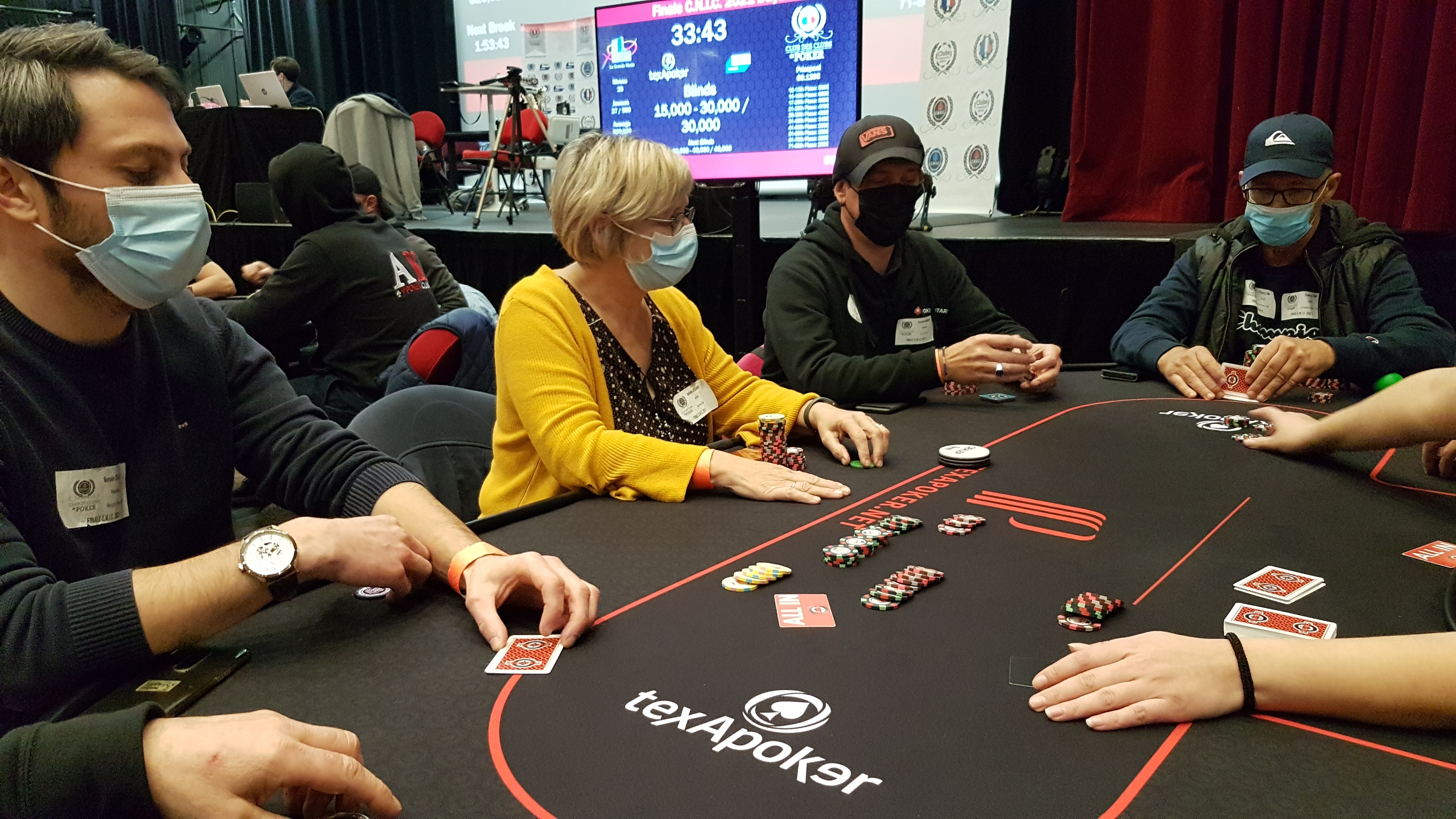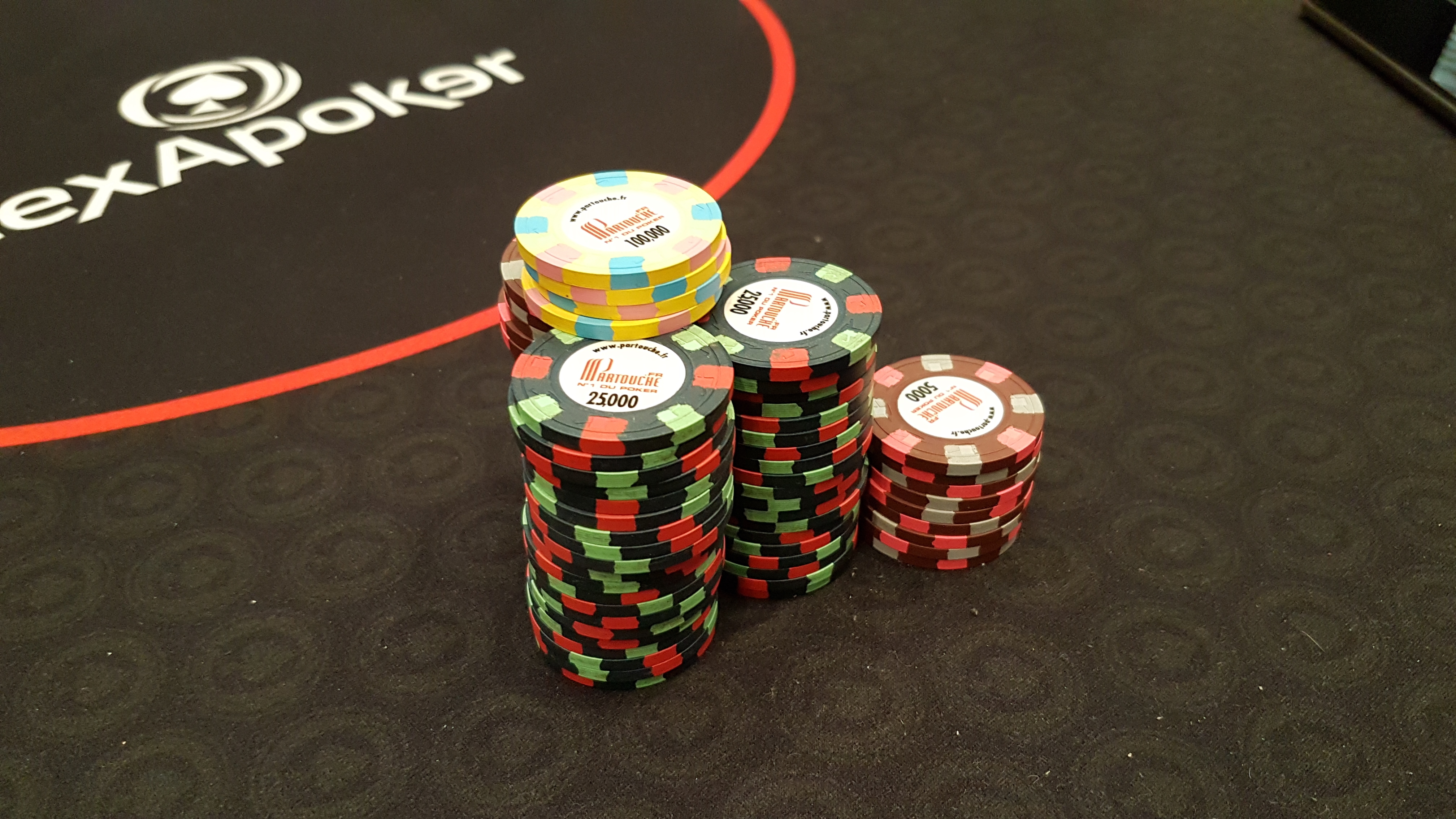 Il reste 27 joueurs, et le field est en break pour 15 minutes. L'occasion pour les équipes de Texapoker d'introduire des jetons JAUNES MON DIEU MERCI ENFIN DES JETONS QUI SE VOIENT de valeur 100k.