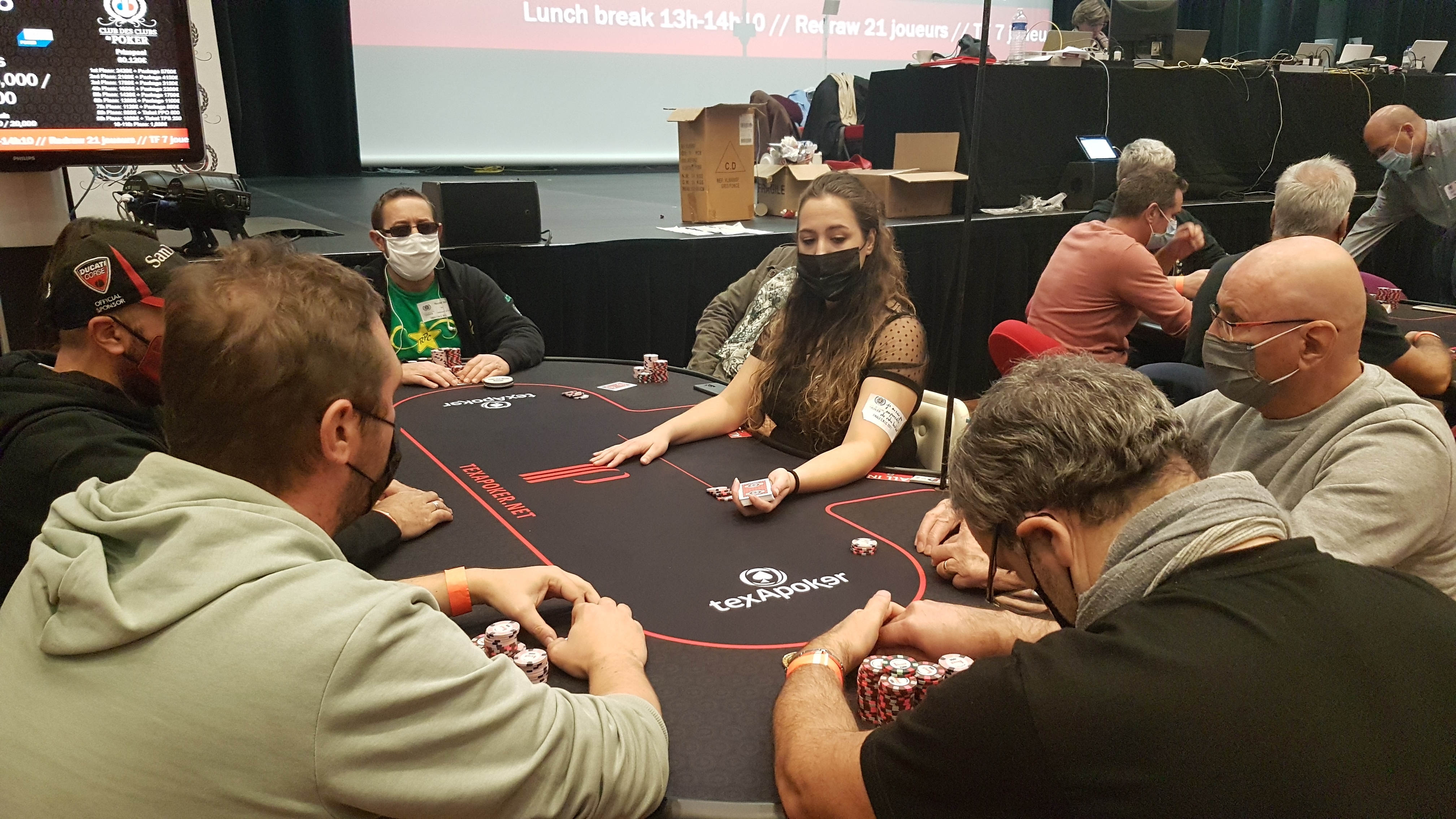 Reprise des hostilités dans 50 minutes, vers 14h20, à 8k/16k/16k, avec 51 joueurs en jeu, et une moyenne de 439k jetons.