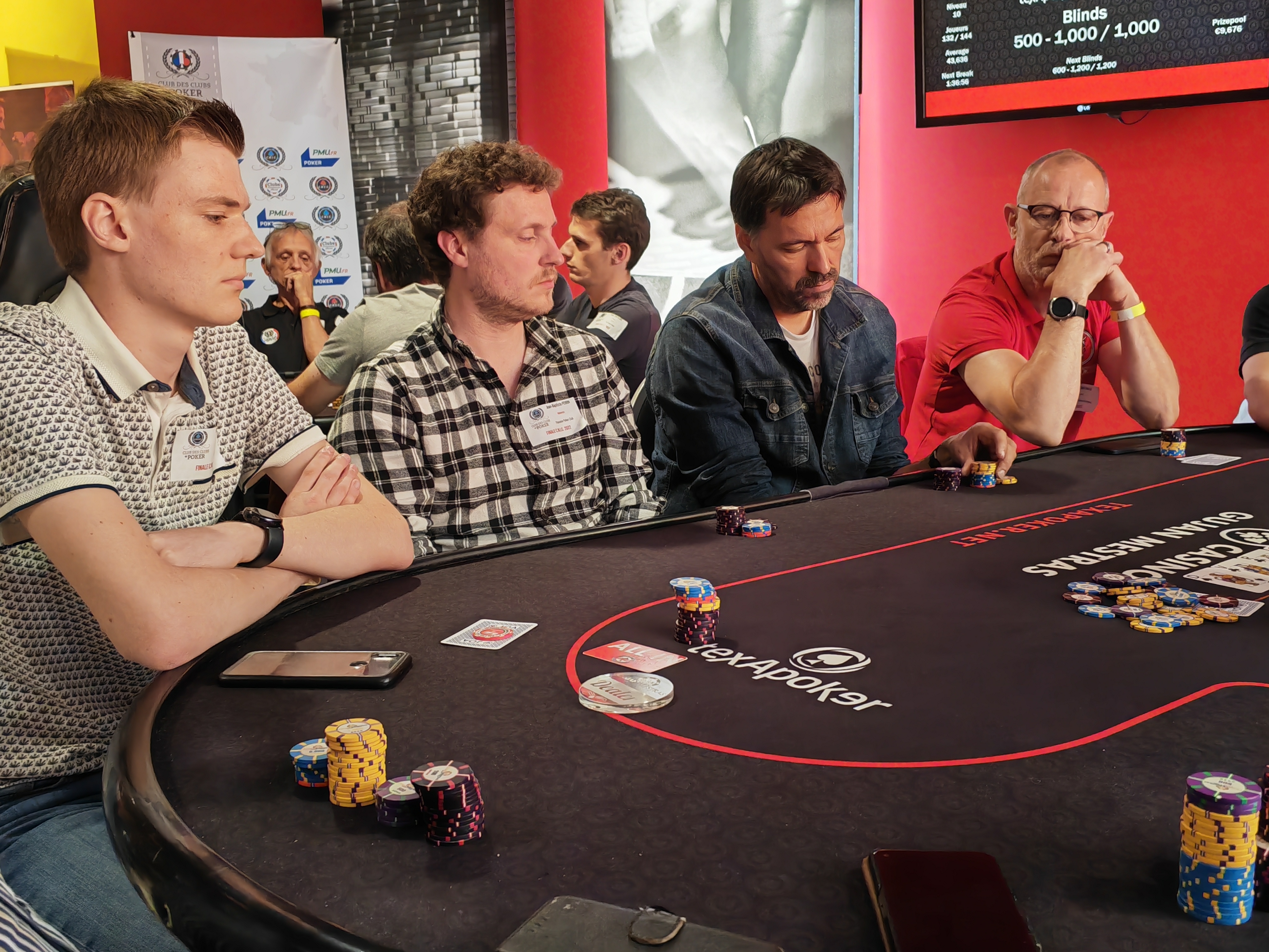 Pourtant, François 'Spitfire' Bataille (Club Neauphléen de Poker, en rouge sur la droite) les a entendu retentir. Il vient de se faire craquer ses As par Pierrick Cuvier (Carré d'As Club, sur en gris sur la gauche).