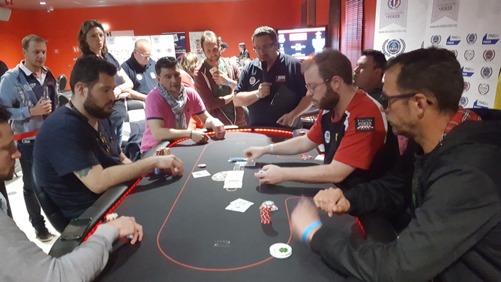 Au BU, Antoine (à la droite de la photo) envoie tout son tapis avec A[c]n[/n]T[c]n[/n], et Pierrick se réveille en BB avec J[c]n[/n]J[c]n[/n]. Le board amènera un J au turn, Franck repart de ce week-end avec 1050€ et une entrée WPT PMU.fr à 1200€, et une entrée CdC Poker Tour à 150€