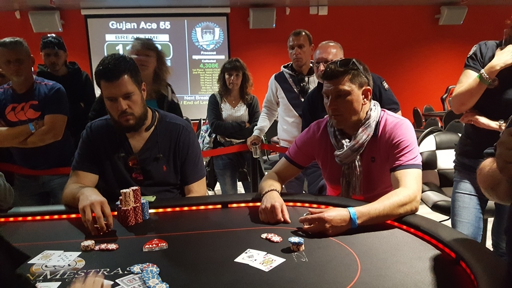 Alors que les 5 joueurs restants sont en jeu depuis un moment, les moves, à 75k/150k/15k sont limités. Surtout pour Franck Marche, avec 650k jetons. Pour lui mettre la pression, en BvB, Pierrick Le Goff, toujours chipleader (depuis le day 1 !) le met à tapis avec Q[c]n[/c]8[c]n[/c]. Sauf que cette fois, Franck se réveille avec A[c]n[/c]Q[c]n[/c]. Franck double, pour grimper à 130k jetons.