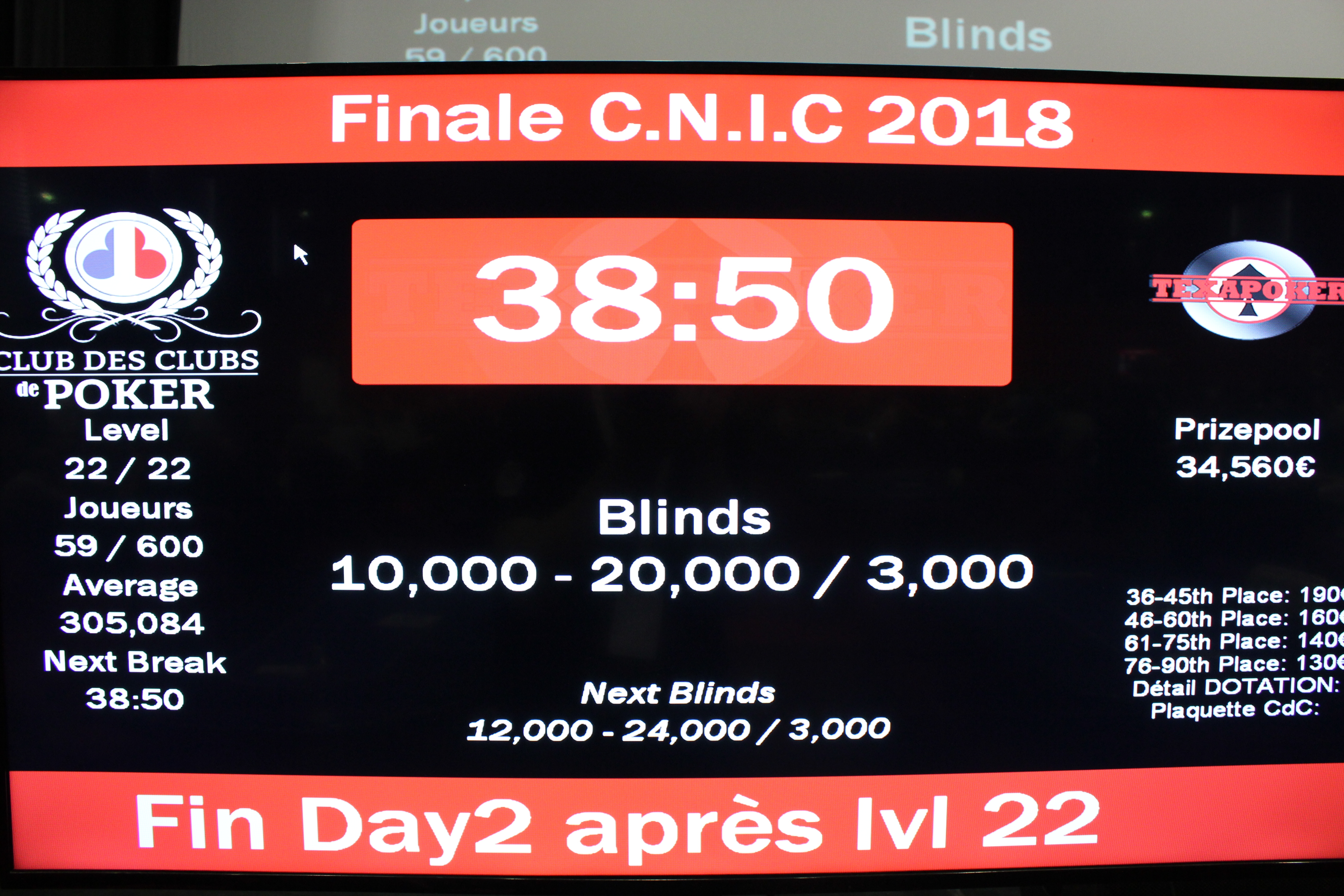 Dernier niveau de la journée pour nos 59 joueurs restants, évoluant désormais avec quinze blindes de moyenne.